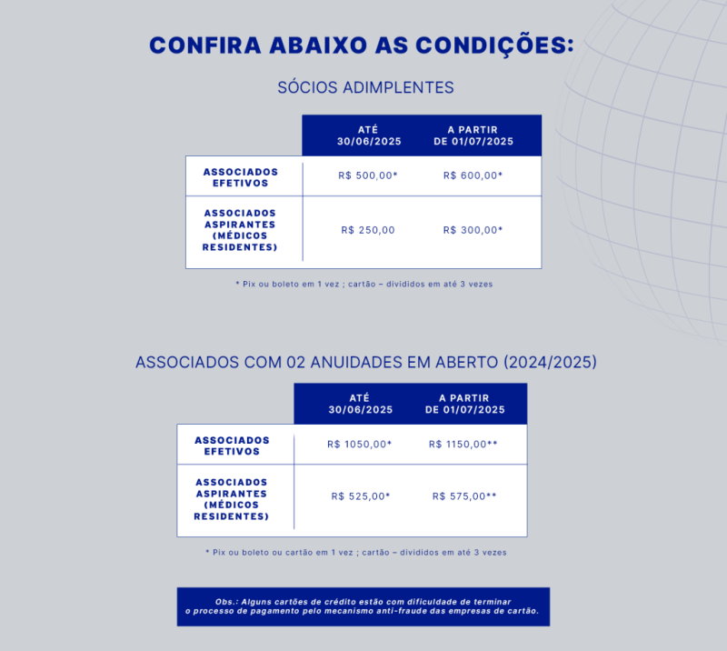 A anuidade 2025 será de R$ 600,00, podendo ser paga com desconto de R$ 100,00 até a data de 07/07/2025. Tal condição também será possível para os associados que estão com duas anuidades em aberto.